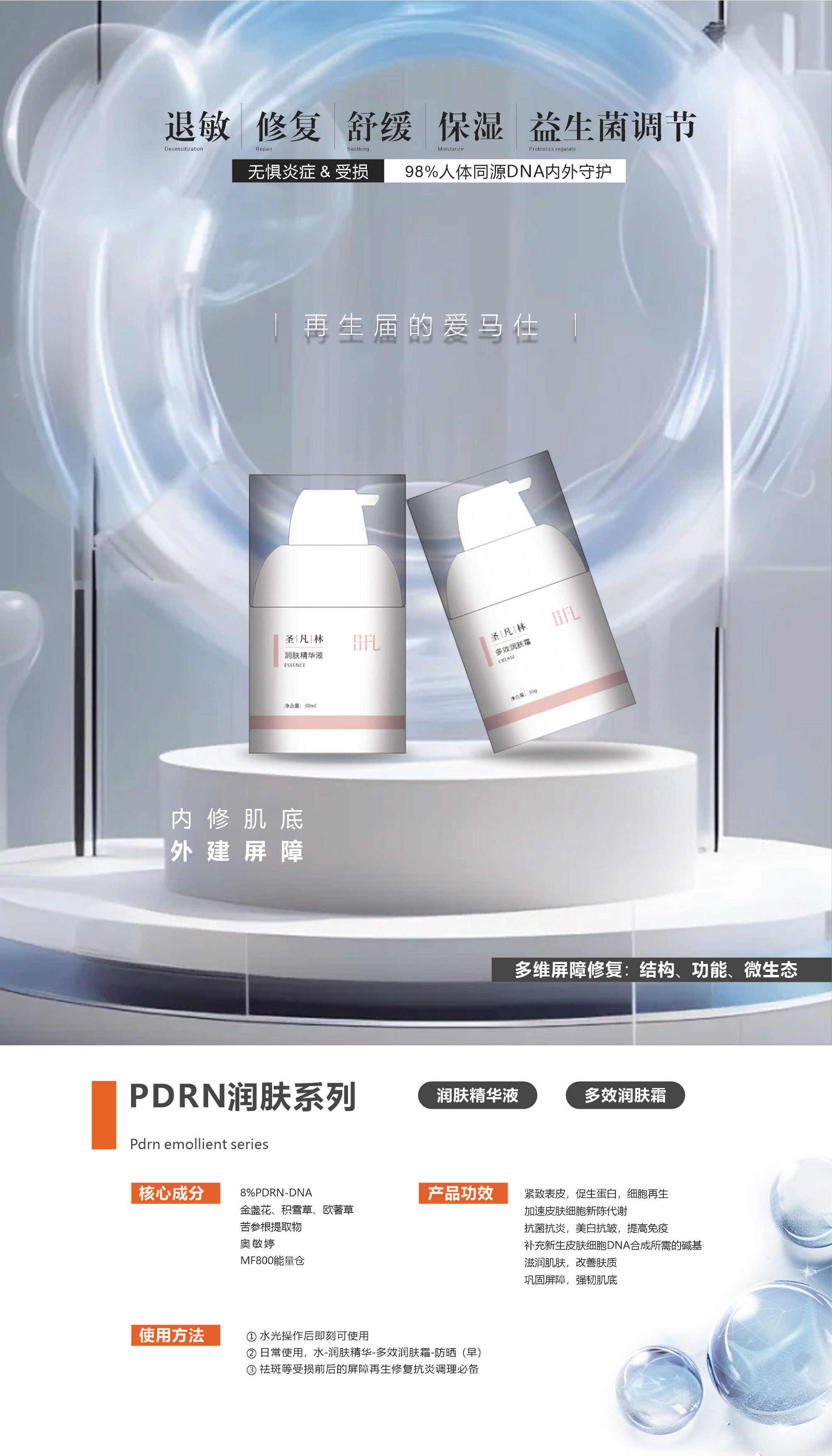 PDRN润肤系列 04-26 阅读 2.84万 概述 PDRN修复家居 持续屏障修复,高效肌肤维稳 .PDRN润护精华 内含PDRN-DNA,紧致表皮,促生蛋白,细胞再生,加速皮肤细胞新陈代谢。配合PDRN再生肌底液快速改善肌肤过敏、炎症、毛孔粗大等问题。 PDRN多效润护霜 内含PDRN-DNA,抗菌抗炎,美白抗皱,提高免疫,美白淡斑,补充新生皮肤细胞DNA合成所需的碱基,滋润肌肤,改善肤质,巩固屏障。强韧肌底,让肌肤由内而外获得新生,持久保持年轻状态。