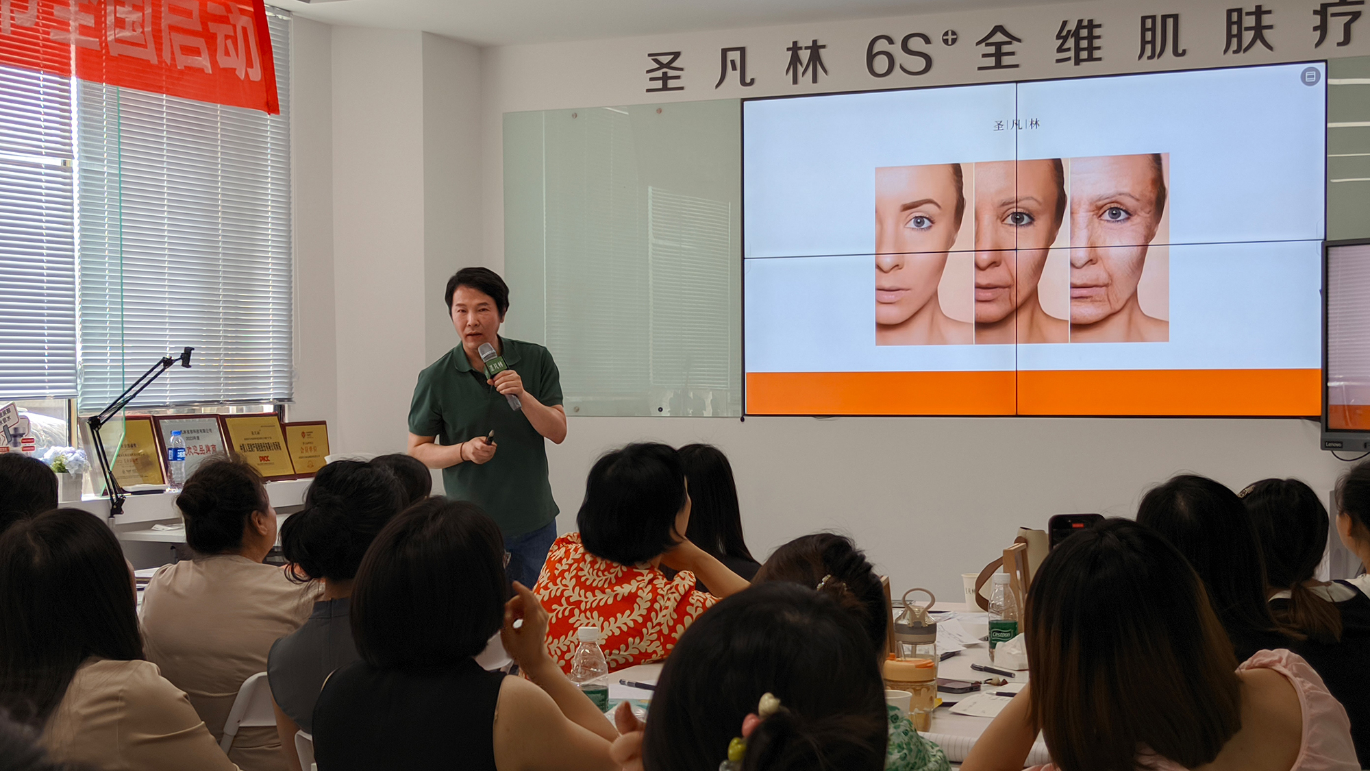 紧接着,圣凡林总裁邹保康先生登台,为与会者带来了一场主题为“专业水光路,八年铸辉煌”的专业赋能课。邹保康先生结合自己十余年的美业开拓经验,深入剖析了当前美业环境的发展趋势。他指出,随着消费者对于美肤需求的不断升级,美业市场正面临着前所未有的机遇与挑战。针对美业老板们最关心的业绩和流量问题,邹保康先生明确指出了下一步的行动方向。他强调,只有通过技术创新、服务升级和营销策略的优化,才能在激烈的市场竞争中脱颖而出。